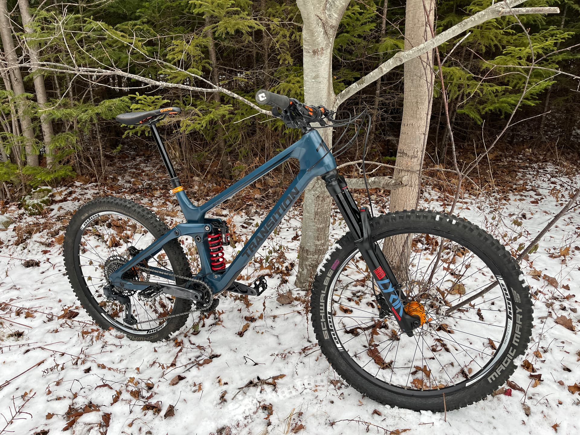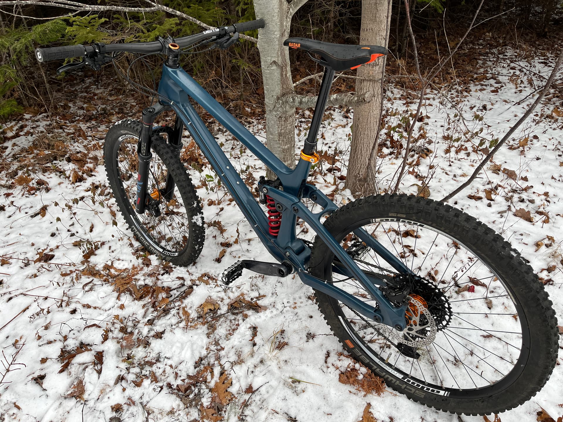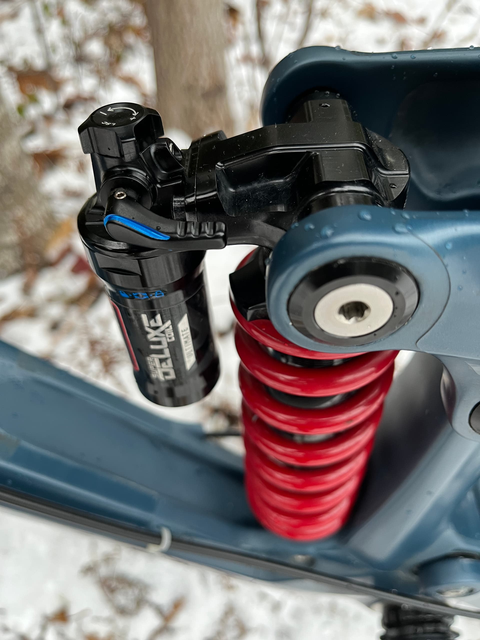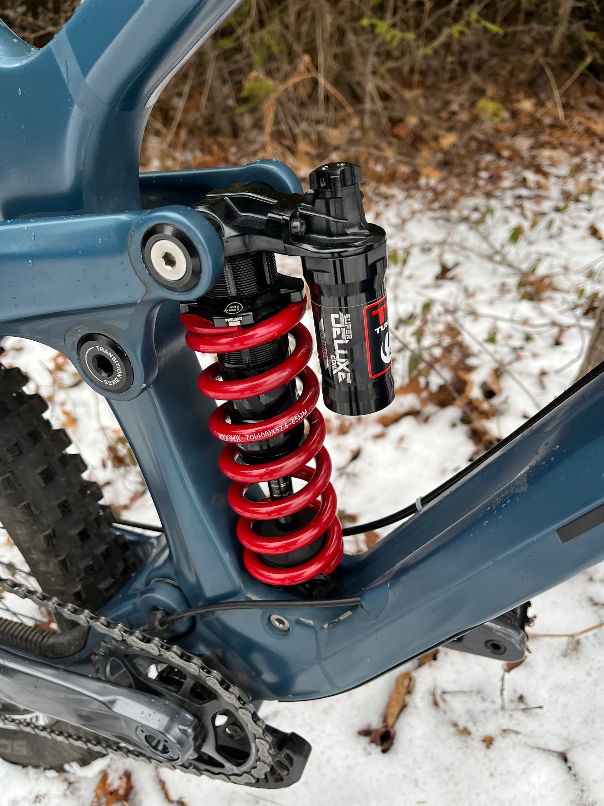 Rockshox Super Deluxe coil rear shock 400lb spring (I’m around 82 kg geared up), spare brand new 450lb spring included.