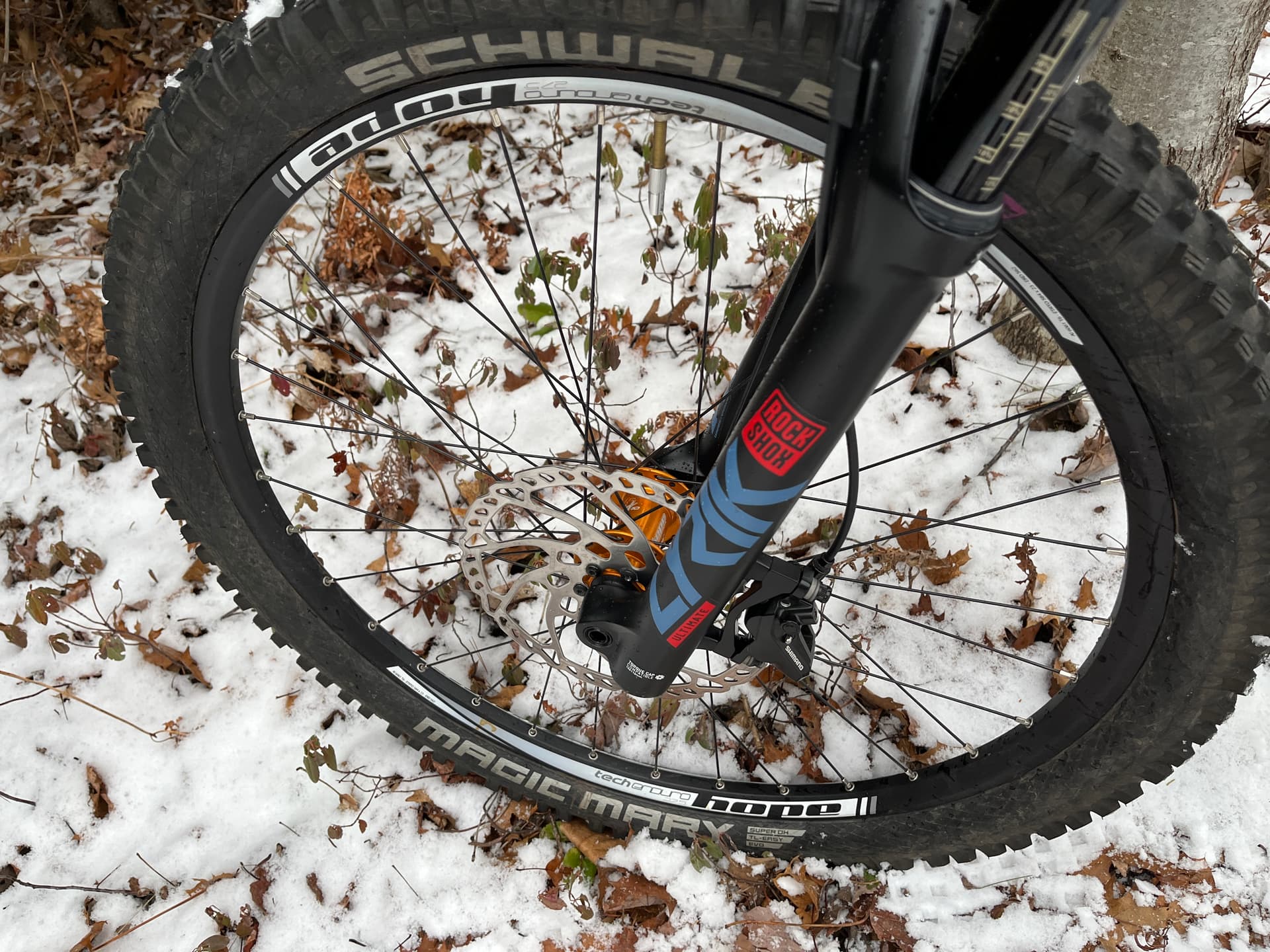 Schwalbe Magic Mary 2.4" tyres, super soft (purple) front, soft (orange) rear. 2 spare used Schwalbe tyres included.