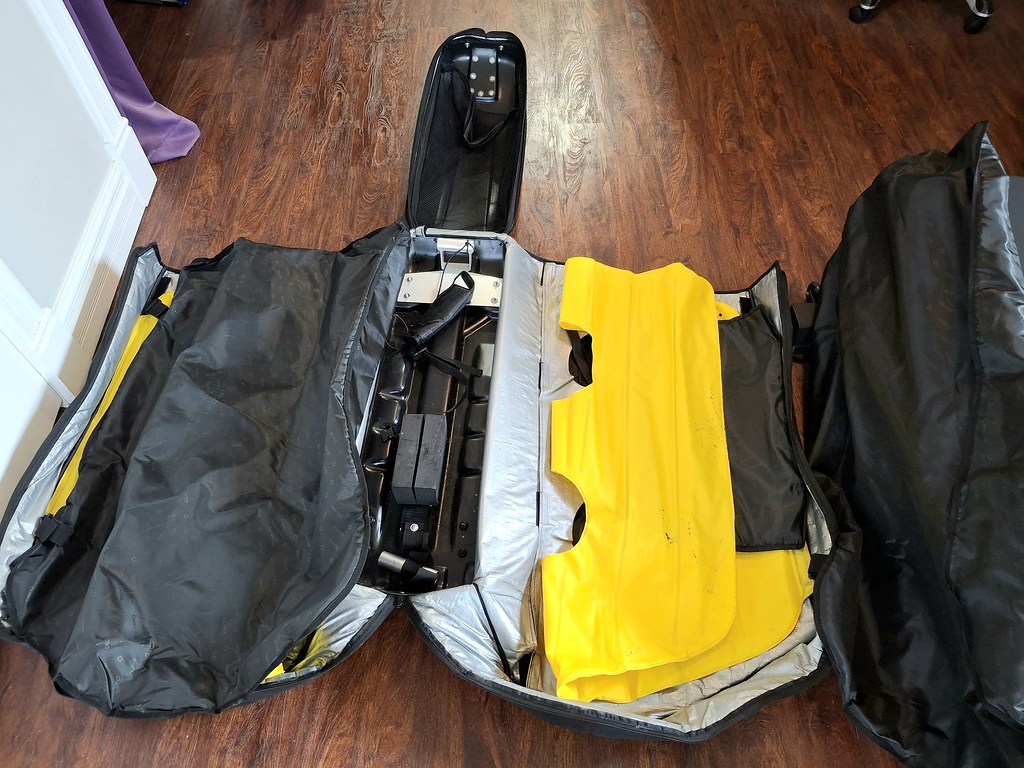 Biknd Helium V4 travel case. I bought this for my road bike, but it will hold gravel and mountain bikes (depending on the bikes length between the axles). I’ve flown my Stumpjumper to BC in this bag. This case rolls up (120cm x 45cm) for storage. It will carry two wheelsets plus your bike. The inflatable bladders protect the bike and wheelsets. Includes adapters for common axle sizes. Weighs less than 20 pounds empty.