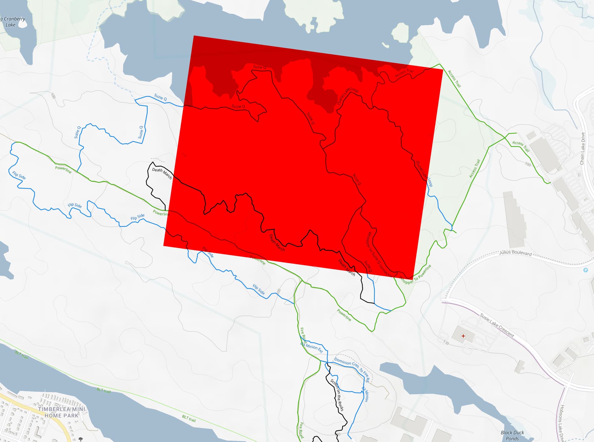 Their map looks a bit skewed, but my best estimate (overlaying their affected area onto the trail forks map) is this.